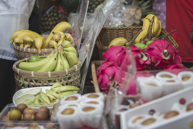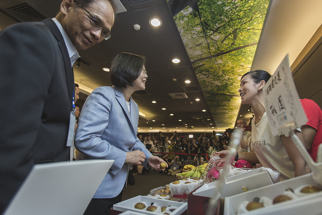 總統抵達後,首先到「有機農夫市集」的「小農有機農產品展示」攤位,參觀臺灣小農生產的各式有機蔬果及茶產品,仔細聽取農友們的介紹,對有機農產品的豐富與多元,留下深刻印象。