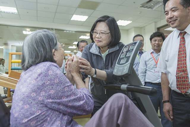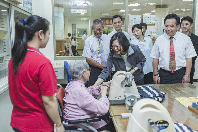隨後,總統觀賞中心爺爺們精心準備、隨著音樂敲擊的太鼓表演,並至中心復健室參觀長輩們操作動腳搖擺機、搖手機、走路平行桿、牽引機及腳踏車等復健器材,對於長輩們的活力十足及健康精神,留下深刻印象。
