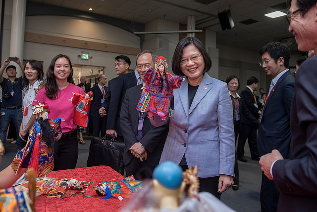 總統於下午視察洛杉磯僑教中心,除參觀中心設施,了解臺美青年運用設施情形,也與正在學習布袋戲文化的青少年一同操偶。