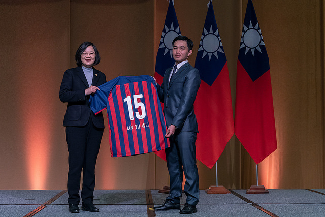 總統特別談及在巴拉圭發展的臺灣足球員—林育葦,她說,相信今天來共進晚餐的鄉親們,在來的路上一定都有看到一個足球造型的建築物,這表示這個國家對足球有一種熱情。同樣的,林育葦帶著他的足球夢,自己一個人來到巴拉圭,相信這過程中,有很多辛苦的地方,是只有他自己知道。不過,在這個熱情的地方,教練和隊友把他當做家人,照顧他、訓練他,成為臺灣和巴拉圭兩國友誼最好的寫照。她期待有一天,或許是下次的世足賽,我們會在更大的國際舞台上,看到育葦的身影。