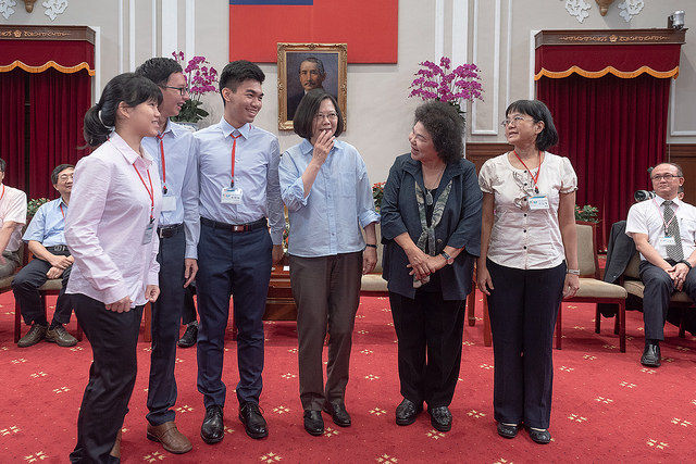 總統說,她很高興今天和代表團師生再次見面,大家已經取得好成績回來了。在座的林榮耀院士,這兩年她常常見到,因為他在推動科學教育的路上,無役不與。也因為林院士的投入,給所有的年輕科學家們很大的支持跟幫助。