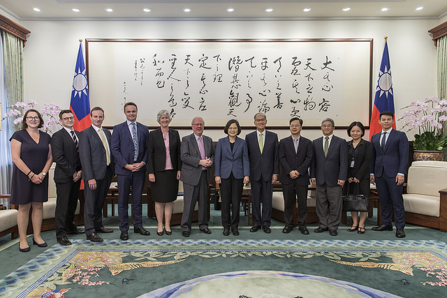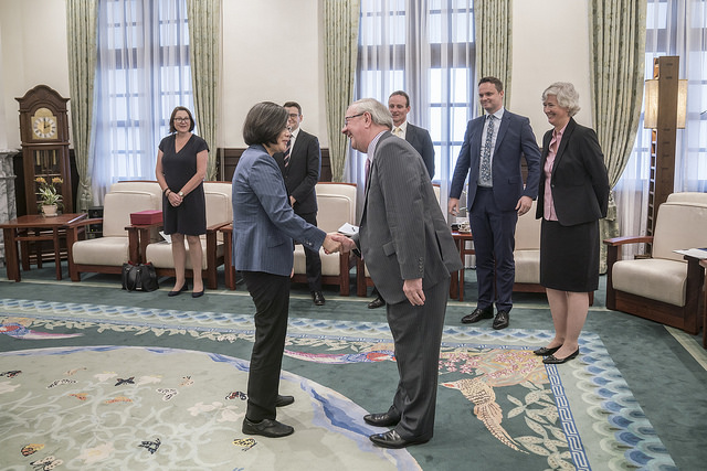 訪團一行由外交部次長徐斯儉、經濟部次長龔明鑫及英國在臺辦事處代表唐凱琳(Catherine Nettleton)陪同,前來總統府晉見總統,國家安全會議秘書長李大維也在座。