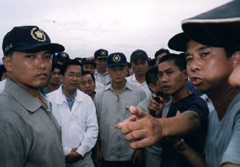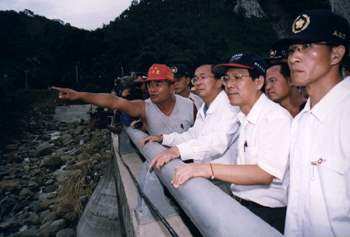 陳總統水扁先生今天上午由行政院長張俊雄、國防部長伍世文、經濟部長林信義、交通部長葉菊蘭、九二一重建會執行長黃榮村、總統府副秘書長陳哲男等陪同,再度前往南投縣,視察水里鄉上安村、信義鄉十八重溪橋和信義橋等災區,實地了解桃芝颱風所造成的災情。