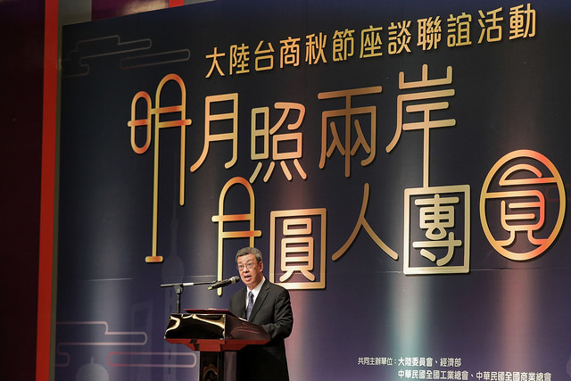 副總統致詞時表示,很高興在「月圓人團圓」的歡樂氣氛中,和臺商老朋友、新朋友及國內重要的工商團體代表見面,也藉此機會祝賀臺商朋友中秋佳節愉快,萬事圓滿如意。