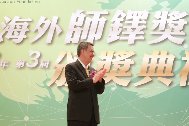 副總統致詞時表示,他非常榮幸再次代表總統,參加「財團法人海華文教基金會」舉辦的「第三屆『海外師鐸獎』頒獎典禮」。他代表政府及總統恭賀獲獎教師,也向海外所有偉大的教師們長年無私的奉獻,從事「十年樹木,百年樹人」的工作,致上最高敬意,並祝大家教師節快樂。