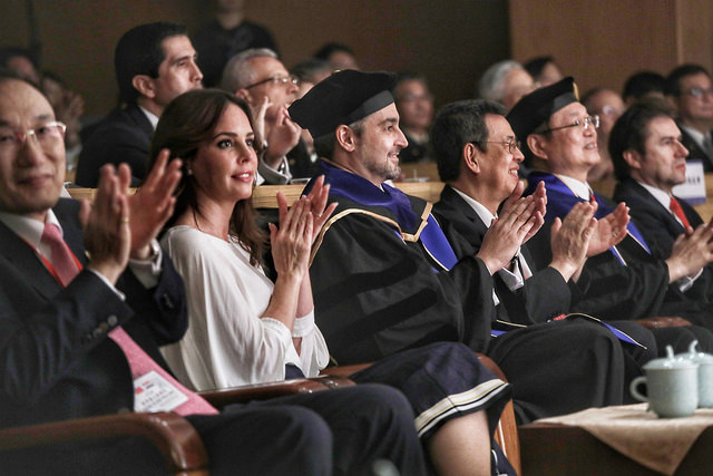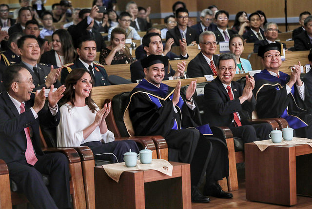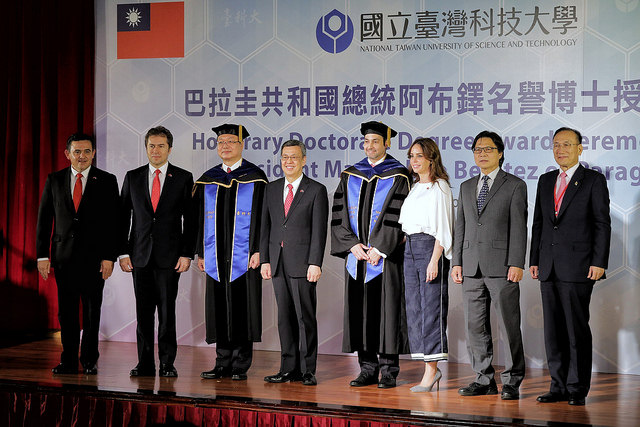 隨後,在副總統見證下,國立臺灣科技大學校長廖慶榮授予阿布鐸總統名譽管理學博士學位,儀式隆重溫馨。