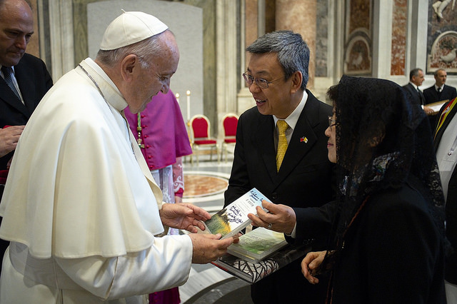 典禮開始前,副總統伉儷由教廷禮官引導向教宗方濟各(Pope Francis)致意。教宗主動向副總統表達,請他代向蔡總統問好,並表達他會為臺灣祈禱。