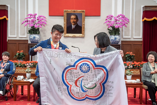 代表團一行由「2018年印尼亞洲帕拉運動會」團長王才翔率領、教育部長葉俊榮及體育署長高俊雄陪同,前來總統府晉見總統,總統府秘書長陳菊也在座。