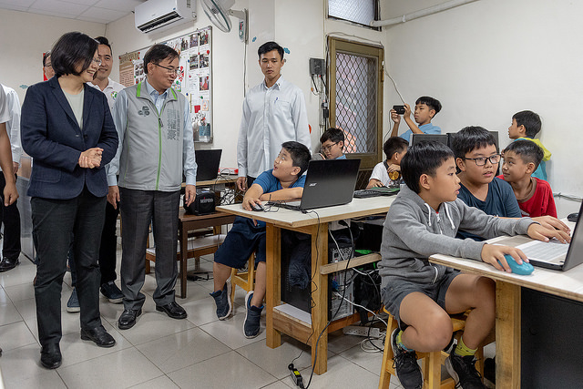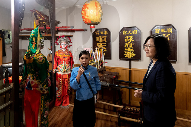 總統抵達時,首先向蘇府大王爺參香,祈求風調雨順、國泰民安。隨後,參觀順天宮文物館及順天書屋,欣賞小朋友操作展示所學的電腦應用程式。
