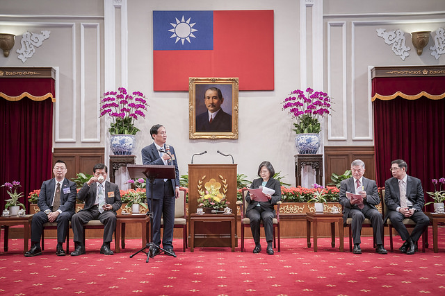 總統致詞時表示,很高興在商人節慶祝大會前夕跟得獎代表見面。她要感謝大家對經貿交流、技術創新,還有企業經營的堅持與投入,不但推動了產業的升級,也帶動整體社會經濟的蓬勃發展,對於大家的努力,她要表達由衷的欽佩跟肯定。
