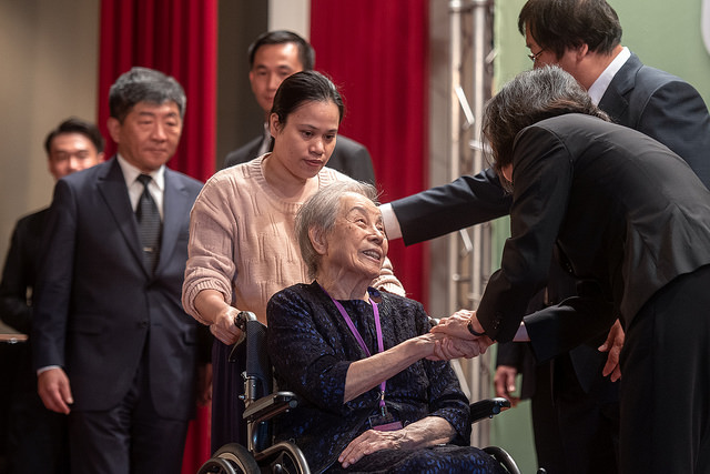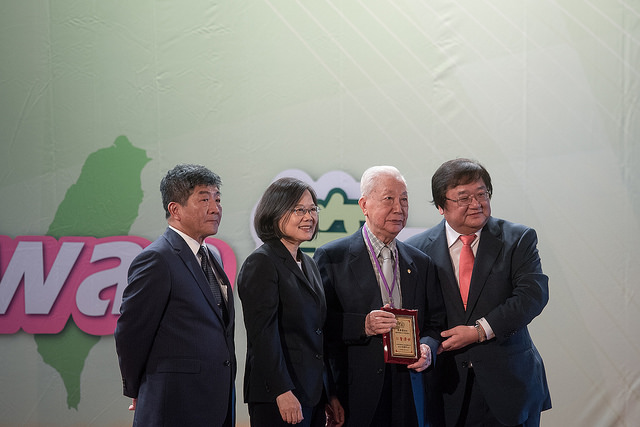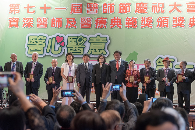總統強調,政府會繼續和各位醫師朋友,一起為增進國民的健康與幸福來努力。她也祝福活動圓滿成功。隨後,總統頒獎表揚行醫70年資深醫師。