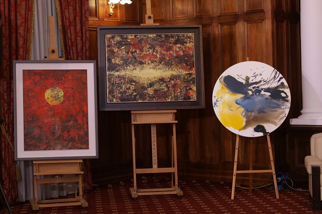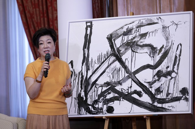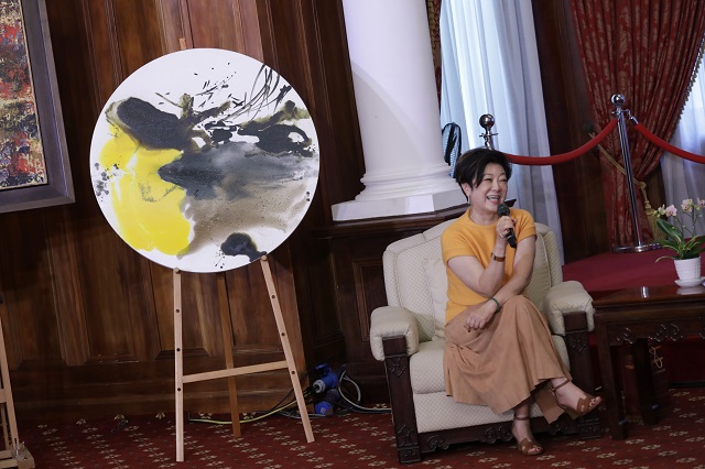 隨後,張女士也向現場媒體介紹畫作名稱分別為「希望之鎖」、「喜悅」、「祝福」及「平安」等畫作,並接受媒體提問,輕鬆互動。