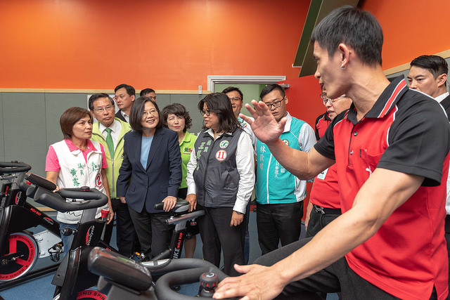 隨後,總統參觀運動中心的「體適能中心」、飛輪教室、綜合球場等各項運動環境及設施,對該中心的良好運作表達肯定之意。