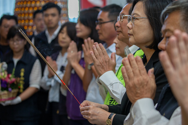 蔡英文總統今(22)日下午前往嘉義市參拜「九華山地藏庵」,祈求風調雨順、國泰民安,並強調臺灣人面對外來壓力,不會屈服,會堅守優質的民主,作出最好的民主抉擇,讓臺灣優質的民主能延續下去。