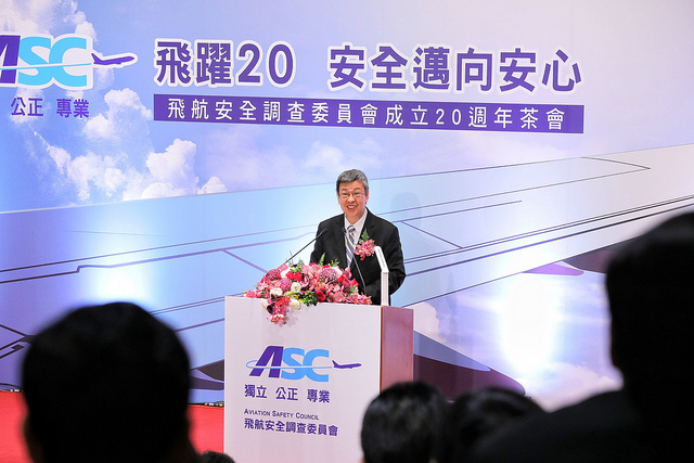副總統抵達後,首先觀看空軍儀隊操槍表演。隨後致詞表示,很高興能來參加飛航安全調查委員會成立20週年的慶祝活動,這是一個重要的里程碑。飛行安全與運輸安全是大家都非常重視的議題,公共交通工具的安全,實際上關係著所有民眾的安全問題,甚至影響到臺灣的國際聲譽,相當地重要。