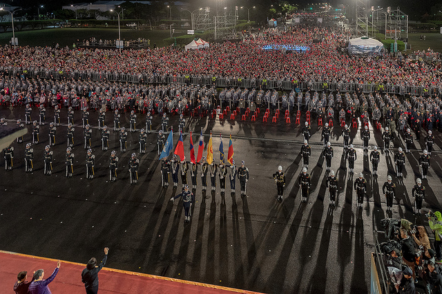 隨後,在國旗歌演奏聲中,中華民國國旗緩緩升起。升旗典禮結束後,總統與副總統伉儷步上舞台,向民眾揮手致意,跟大家一起迎接中華民國108年的開始。