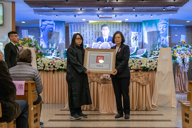 蔡英文總統今(24)日上午出席國策顧問黃爾璇先生公祭典禮時親頒褒揚令,表彰黃爾璇對臺灣民主發展的卓越貢獻。