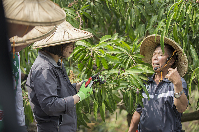總統抵達後,在行政院農業委員會主委陳吉仲及臺南市長黃偉哲陪同,和園主蔡明詳的講解及介紹下,佩戴斗笠、手套及手持剪刀,親自體驗芒果剪枝疏果過程。