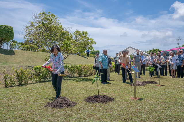 兩國元首在參觀國會後,前往植樹紀念儀式地點,聽取我駐帛琉技術團團長楊邦棋及帛國自然資源部長Fred Sengebau介紹果樹苗來源及品種,並一同執鏟栽種,蔡總統種植「金煌芒果」果苗,雷蒙傑索總統則種植「愛文芒果」果苗,象徵臺帛兩國關係緊密深厚,邦誼永固。