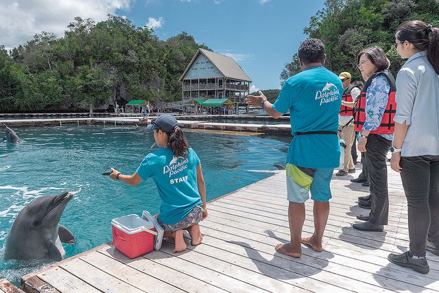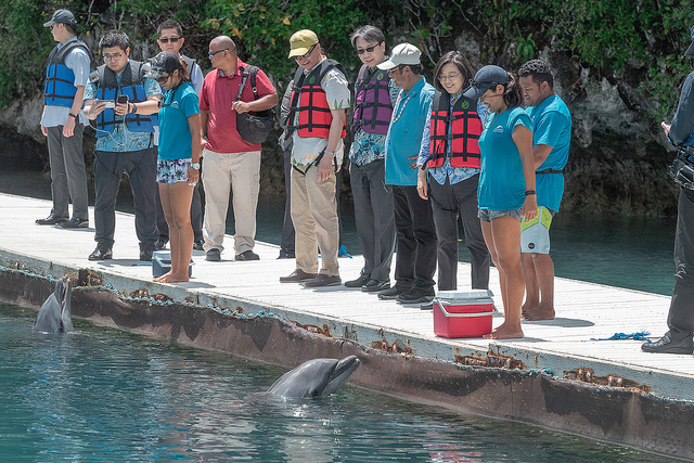 隨後,兩國元首一行轉往海豚灣,由海豚灣非營利組織代表Tanaka先生迎接,並陪同兩國總統參觀海豚復育成果。該組織向總統說明時也表示,這裡的海豚是以自然的方式復育,向外游出後還會游回來。