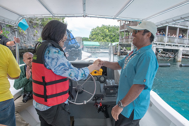 蔡總統自帛琉老爺大酒店碼頭登船,雷蒙傑索總統為示禮遇與重視,特別親自駕船陪同蔡總統見證帛琉遠近馳名的海上風光。蔡總統一行首先前往尼可灣,參觀期間由生態保育專家Dr. Golbuu向總統介紹灣內特殊生態,以及駐帛琉大使周民淦簡介灣內可見之臺灣觀光旅館。