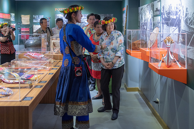 之後,蔡總統在夷將主任委員陪同下,參觀由我原民會協助策劃,今天開展的臺灣原住民文物專區「溯原追藝-臺灣原住民族工藝文化特展」,並在帛琉國家博物館館長Olympia E. Morei-Remengesau導覽下,參觀帛琉文物專區,欣賞帛方人民演唱當地民謠,現場氣氛和樂喜悅。稍早,夷將主任委員也見證了原民會所屬的原住民族文化發展中心與帛琉國家博物館簽署文化合作協定,期將臺灣原住民族的文化介紹給帛琉朋友。