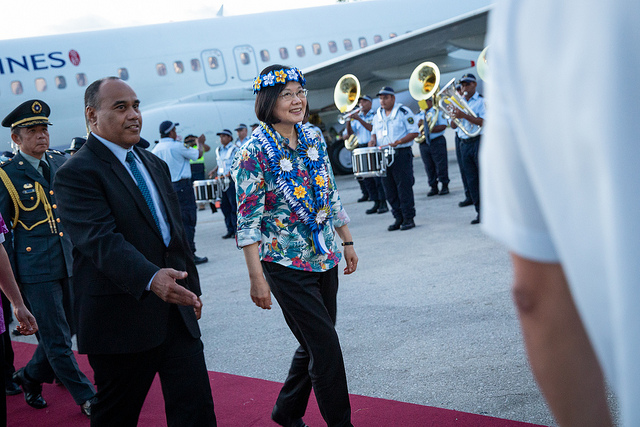 專機停妥後,我國駐諾魯大使周進發及諾魯外交部次長阿洛誼(Michael Aroi)登機迎接蔡總統。蔡總統向歡迎人員揮手致意,由我外交部長吳釗燮陪同步下機梯,諾魯教育部長史考蒂(Charmaine Scotty)則迎於機梯前;蔡總統也接受諾國女士獻戴花環,並步行通過女警儀隊,諾國警察樂隊現場演奏聖歌表達歡迎之意,氣氛熱鬧歡愉。