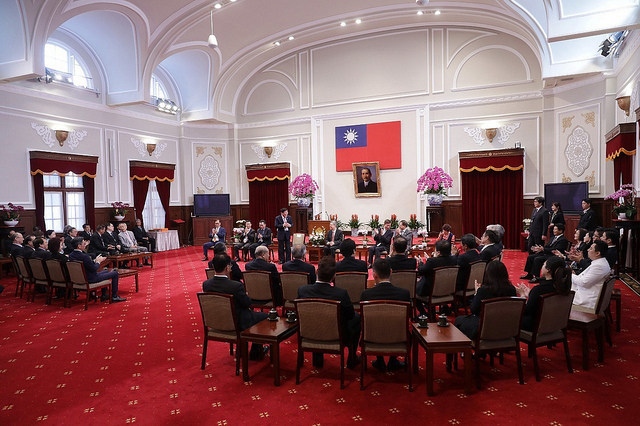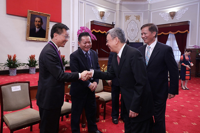 「第26屆亞洲臺灣商會聯合總會回國訪問團」一行,包括總統府國策顧問林見松,由總會長邱文潛率領、僑務委員會副委員長高建智陪同,前來總統府拜會副總統。