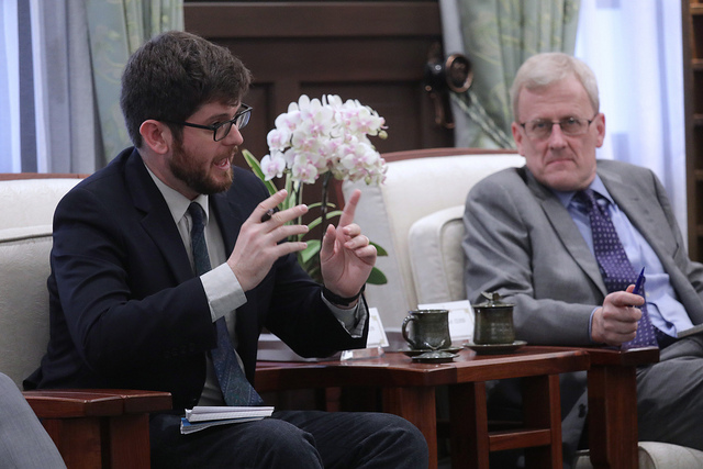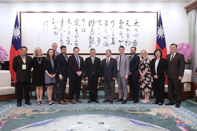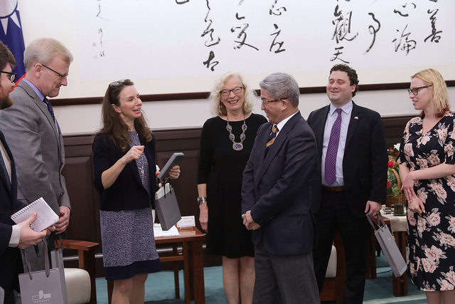訪團一行包括《華盛頓郵報》(The Washington Post)專欄作者羅金(Josh Rogin)、《巴爾的摩太陽報》(The Baltimore Sun)社論版副主編畢翠夏(Tricia Bishop)、《洛杉磯時報》(Los Angeles Times)國防記者柯大衛(David Cloud)、《華盛頓時報》(The Washington Times)評論版副主編艾伊森(Ethan Epstein)、《彭博新聞社》(Bloomberg LP)主播兼特派員伊萊姆(Ramy K.Inocencio, Jr)、《全美公共廣播網》(NPR)特派員佘艾莉(Alina Selyukh)、《政治報》(POLITICO Pro)國內新聞記者溫札立(Zachary Warmbrodt)、《東西中心》(East-West Center)媒體計畫經理柯蘇珊(Susan Kreifels),由外交部次長徐斯儉陪同,前來總統府拜會副總統。