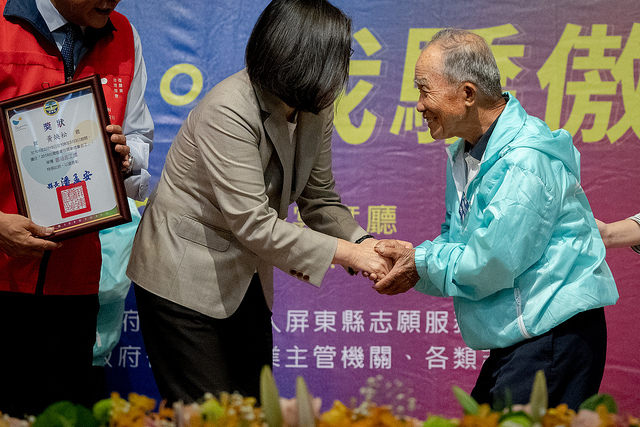 總統說,這一次屏東燈會,總共有6,000多名志工投入,這是一個很驚人的數字。潘縣長說,大家放下手邊的工作,還有課程、事業,一心一意地把我們燈會做好。其中,年齡最小的志工是13歲,年齡最大的則是86歲,她要恭喜大家,「你們都是這次燈會中最大的功臣。」
