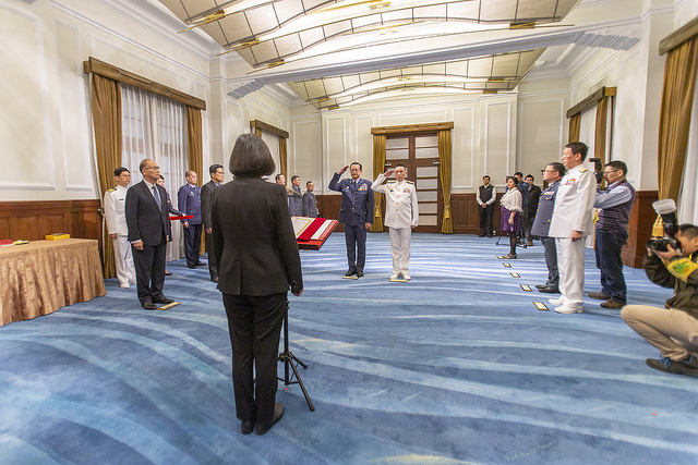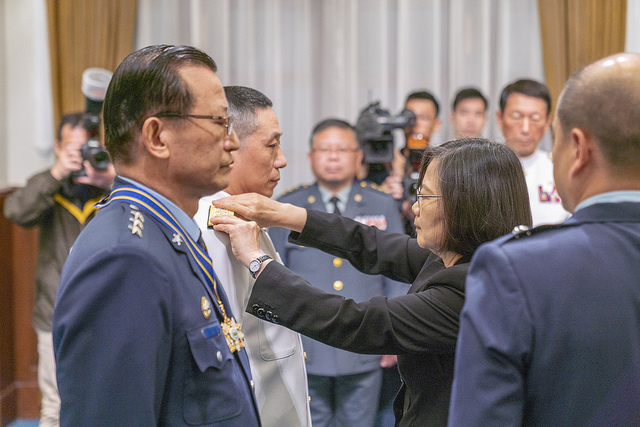 蔡英文總統今(1)日上午主持「國軍重要高階幹部授勳暨晉任布達授階典禮」,頒授國防大學吳萬教校長「四等寶鼎勳章」以及授階新任副參謀總長執行官劉志斌上將;她也請國人不用懷疑我們國軍捍衛臺灣的能力和決心。國軍守衛疆土沒有假日,她會和各位戰士一起奮鬥到底,國土一寸不讓。