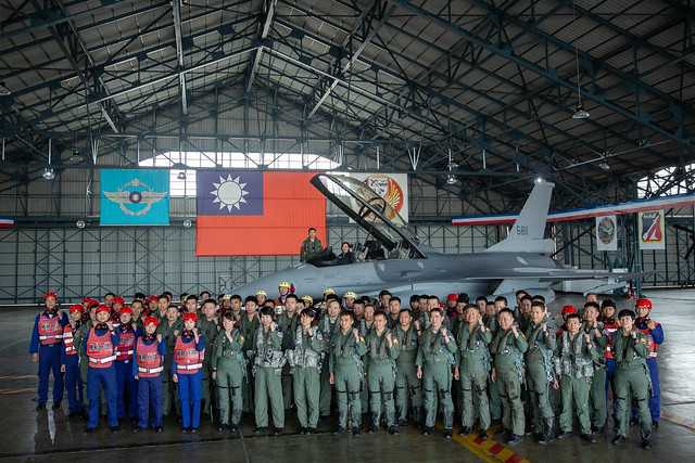隨後,總統在聯隊長顏有賢引導下,登上F-16V座艙,聽取座艙設備簡介並與現場官兵合影。總統也親頒加菜金慰勉國軍辛勞。