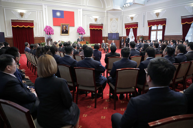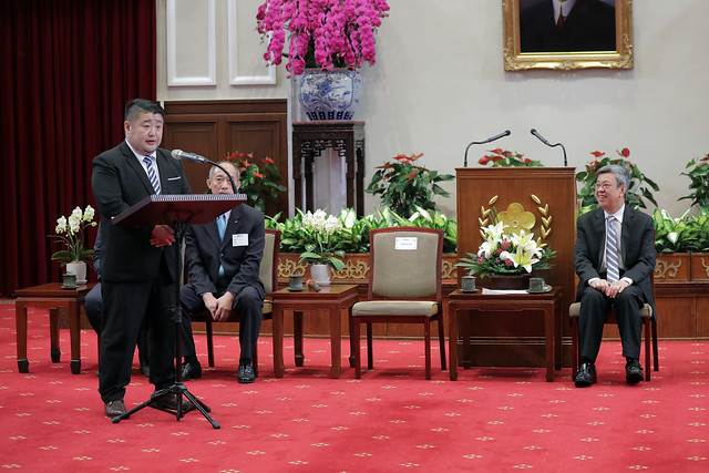 訪賓一行由國際青年商會中華民國總會總會長林恩億率領、內政部主任秘書陳茂春陪同,前來總統府拜會副總統。