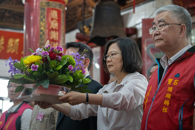 蔡英文總統今(19)日上午前往宜蘭縣參拜蘇澳「南天宮」與「進安宮」,祈求媽祖保佑臺灣風調雨順,國泰民安,隨後至「春陽號漁港小書房」及「冬山幸福長青學苑鹿埔站」參訪,與當地鄉親們寒暄互動。