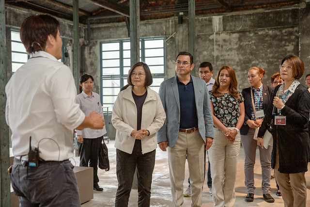蔡總統與莫拉雷斯總統伉儷及訪團一行在外交部長吳釗燮、桃園市長鄭文燦伉儷等人的陪同下一起欣賞影片,瞭解「大溪老茶廠」的歷史,也參觀製茶機、捻茶機等歷史文物,並一起品茶,體驗臺灣特有的茶文化。