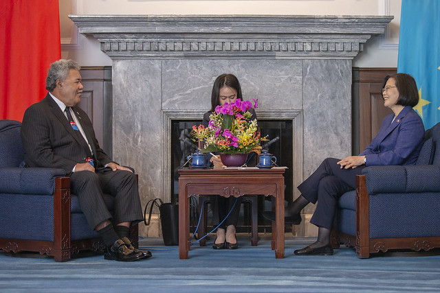蔡英文總統今(3)日上午在總統府接見吐瓦魯國總理索本嘉(Enele Sosene Sopoaga)伉儷訪團,並與總理共同見證兩國交通部長簽署《中華民國(臺灣)與吐瓦魯政府在1978年航海人船員訓練、發證和當值標準國際公約架構下承認在吐瓦魯國籍船舶服務之船員所持訓練與適任證明文件協定》,盼持續深化各項合作,共創雙方人民福祉。