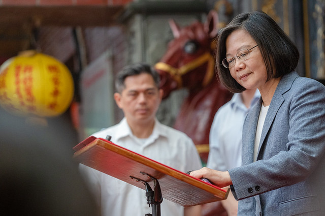 蔡英文總統今(14)日上午出席「保儀大夫1262週年聖誕千秋祝壽三獻大典」,祈求臺灣風調雨順、國泰民安,並期盼在保儀大夫的保佑下,大家一起努力來顧國家、拚經濟、顧生活。