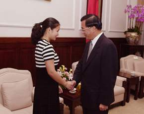 陳總統水扁先生今天接見連續三年獲得美國英特爾(Intel)世界科學暨工程競賽獎得主賴姝安,對她傑出的表現,表示祝賀之意。