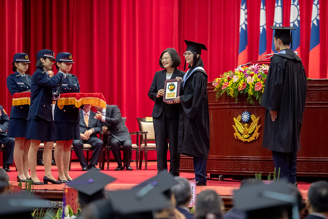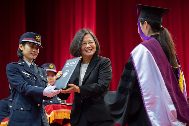 總統接著恭喜畢業生,排除了所有的困難順利畢業,她希望畢業生能把這樣的精神,投入到未來的崗位上,共同守護我們的國家。