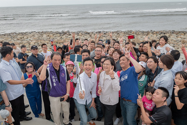 隨後,總統驅車前往新竹漁港,在新竹市長林智堅的陪同下視察「前瞻基礎建設新竹漁港」。總統抵達後於親子沙灘與現場民眾進行問答互動,發送冰棒給答題的小朋友們,接著也體驗電動自行車及放風箏等活動,並與現場民眾自拍,現場氣氛熱鬧歡愉。