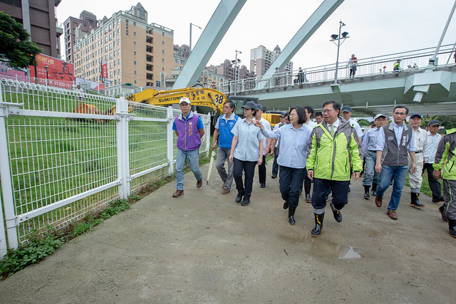 總統說,中央會持續挹注經費,尤其是前瞻基礎建設計畫的經費,與地方政府一起努力,務必讓南崁溪的全河流域整治完成,讓住在附近的居民都能安居樂業。