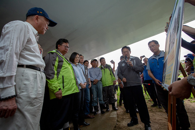之後,總統也前往視察「南崁印象大橋河川整治成果」。首先聽取桃園市政府水務局副局長耿彥偉簡報,了解南崁溪流域治理效益與預期成果。