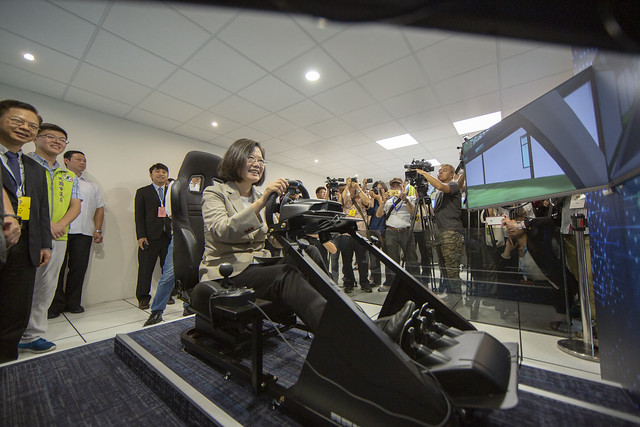 隨後,總統與鄭文燦市長一同完成開幕啟動儀式,並在主辦單位陪同下參觀展示館,也親自體驗自駕車模擬訓練及搭乘自駕車。