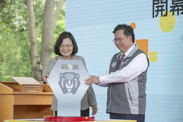 總統致詞時表示,今天虎頭山創新園區正式開幕,這裡把臺灣一流的產業科技人才集合起來,更要把大家的專業能力轉化成臺灣產業創新最重要的基礎。鄭文燦市長非常重視這個計畫,請她一定要來支持大家。她不用多想,很快就答應,因為她知道,臺灣產業發展的未來就是AIoT,而AIoT的未來就在桃園。