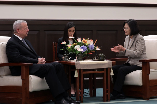 總統致詞時表示,歡迎訪團成員來到總統府,她很高興連續兩週在總統府接待布魯金斯研究院的訪問團。上週她剛跟卜睿哲(Richard Bush)博士見面,今天也非常歡迎艾倫(John Allen)將軍在時隔15年後,第一次以布魯金斯研究院院長身分,率團訪問臺灣。