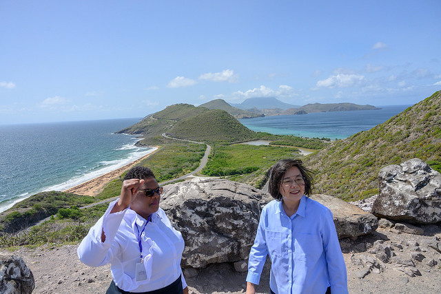 在前往尼維斯島前,訪團一行首先至聖啟茨島(St. Kitts)的熱門觀光打卡景點-提摩西山丘(Timothy Hill),體驗克國景色之美。站在該山丘上,可以俯瞰一山之隔的兩洋分界,左邊是波濤洶湧的大西洋,右邊則是風平浪靜的加勒比海。