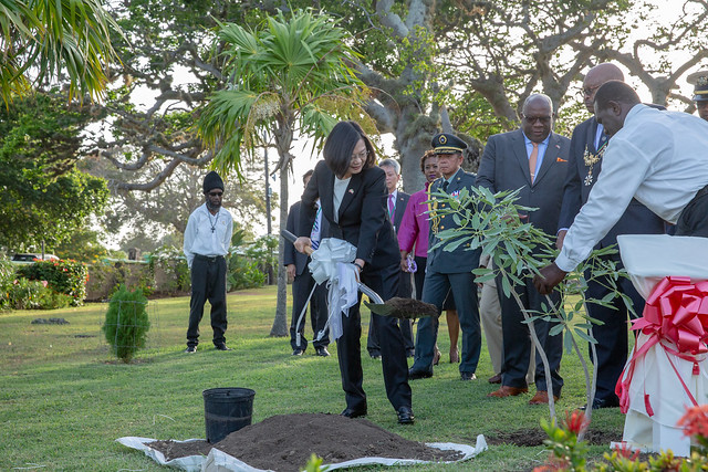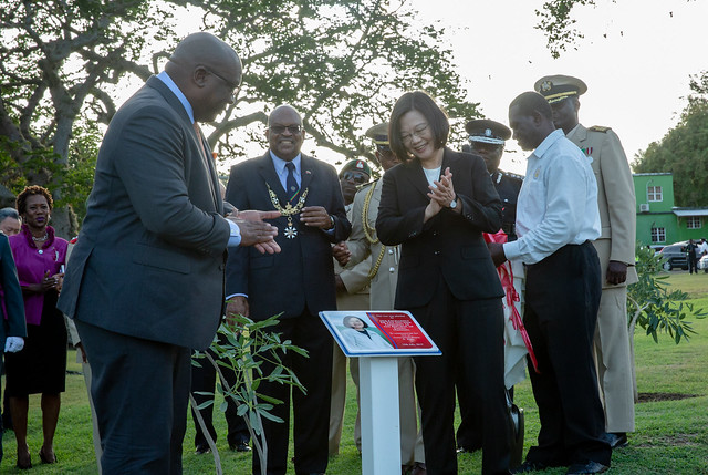 總統抵達總督府後,席頓(Tapley Seaton)總督親自迎接,隨後共同接受禮兵列隊致敬。在演奏兩國國歌後,總統在總督陪同下前往植樹儀式地點,種植「黃花風鈴木」樹苗並揭紀念牌,象徵臺克兩國關係緊密深厚,邦誼永固。