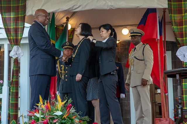 總統提到,更讓她感動的是,1983年聖克里斯多福及尼維斯獨立建國時,第一個建立外交關係的友邦,就是中華民國臺灣。而席頓總督當時則是來臺洽談建交的重要推手,從總督閣下手中接受勳章,意義非常重大。