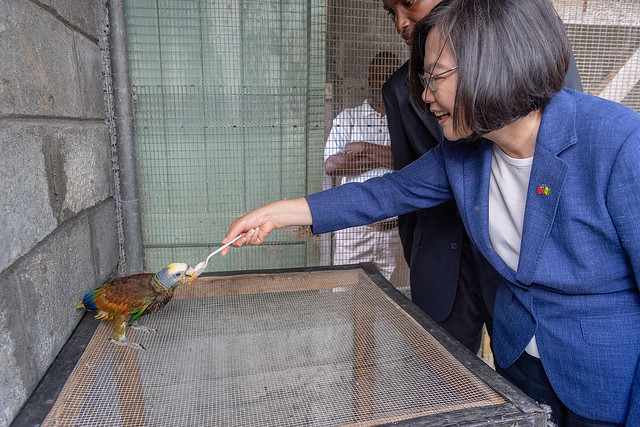 下午,總統前往聖文森植物園參觀。首先前往鳥園參觀聖文森國鳥亞馬遜鸚鵡(Amazona guildingii)。亞馬遜鸚鵡為聖文森生長的特有鳥類,羽毛顏色非常鮮艷,看到總統來訪,還會主動招呼:「Hello!」。目前全球總數不到500隻,已被列於國際自然保護聯盟瀕危物種的紅色名錄。