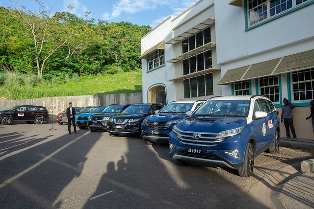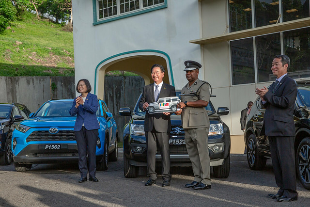 隨後,總統出席「聖國警備用車贈交儀式」。聖國因山勢起伏,地形崎嶇,致警車耗損嚴重,我國政府同意援助採購2部警用機車及8部警用車。總統特別利用此次到訪機會,見證外交部長吳釗燮將警備車樣板贈予聖國警察總監江克林,象徵我國支持提升聖國警察執勤及警備能量,協助改善聖國治安。